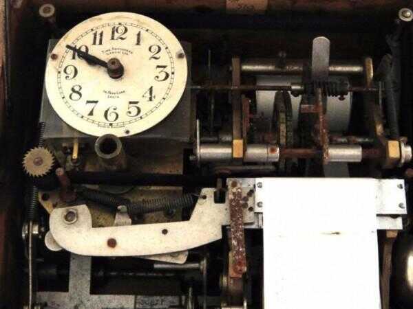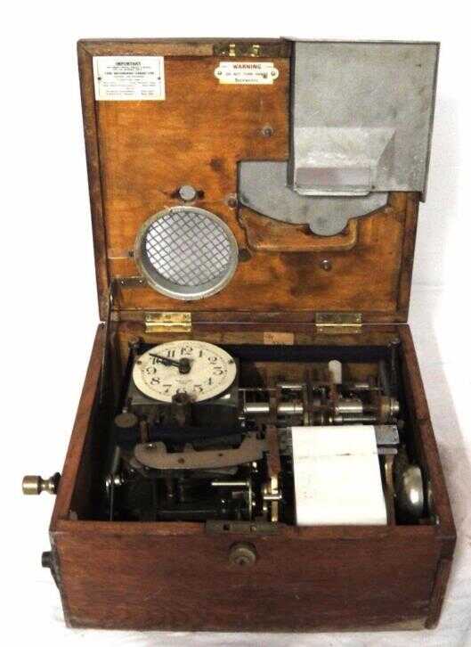 0236 Engels kasregister. National, 40-er 50-er jaren. Met tijdklok, volledig functionerend. Hoog: ca. 15 cm. Lang: ca. 34 cm. Diep: ca. 32 cm.U KUNT OOK ONZE 2DWINKEL BEZOEKEN, U ZULT VERSTELD STAAN.