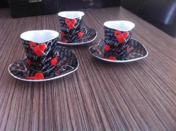 Kenmerken Conditie: Zo goed als nieuw Type: Kop(pen) en/of Schotel(s) Stijl: Overige stijlen Materiaal: Porselein Beschrijving Diverse koffiekopjes (espresso en cappuccino) aangeboden. Cappuccino: 5xEspresso hartjes 3xEspresso 6 kopjes en 6 lepels. B