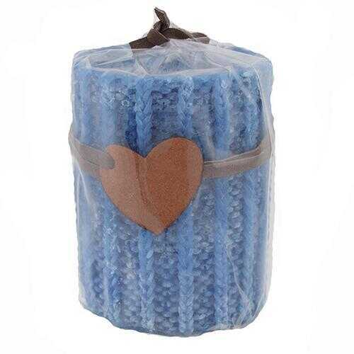 Blauwe stompkaarsMet een gebreidt effect en lederen hartje