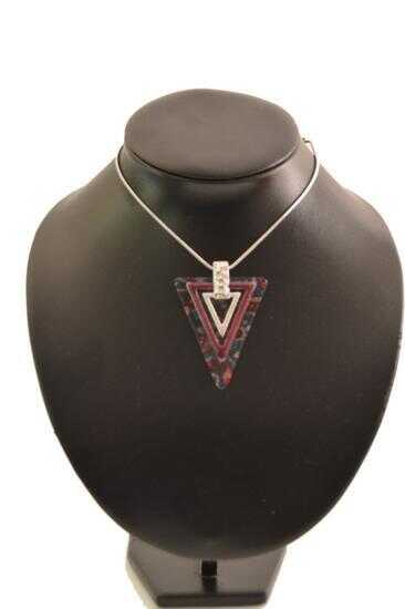 Kenmerken Conditie: Nieuw Beschrijving Artikelcode: KET-1247Kleur: Zilver / Bordeaux.Sluiting: Karabijn.Merk: Classic Accessories.Beschrijving:Ketting in zilverkleurige uitvoering.Hanger In driehoekige vorm van kunstof met fantasieprint. Sjoppertjes