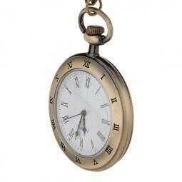 Kenmerken Conditie: Nieuw Beschrijving Zakhorloge modern.Display → analoog.Aandrijving →quartsIncl. ketting.Secondewijzer → ja.Kleur wijzerplaat → wit.Kleur behuizing → brons.Ketting lengte → ca 37cm.Diameter → 4,8cm.